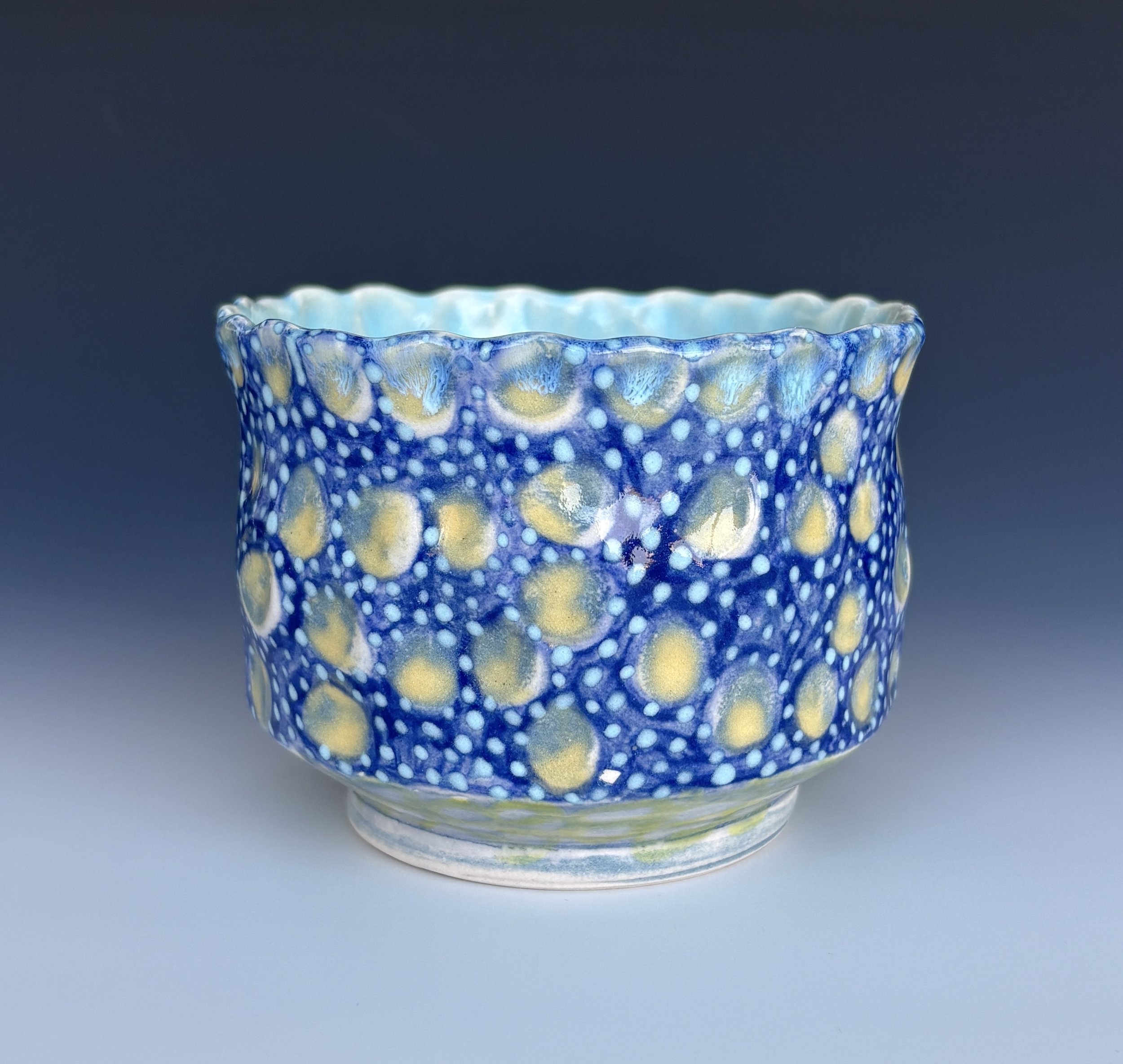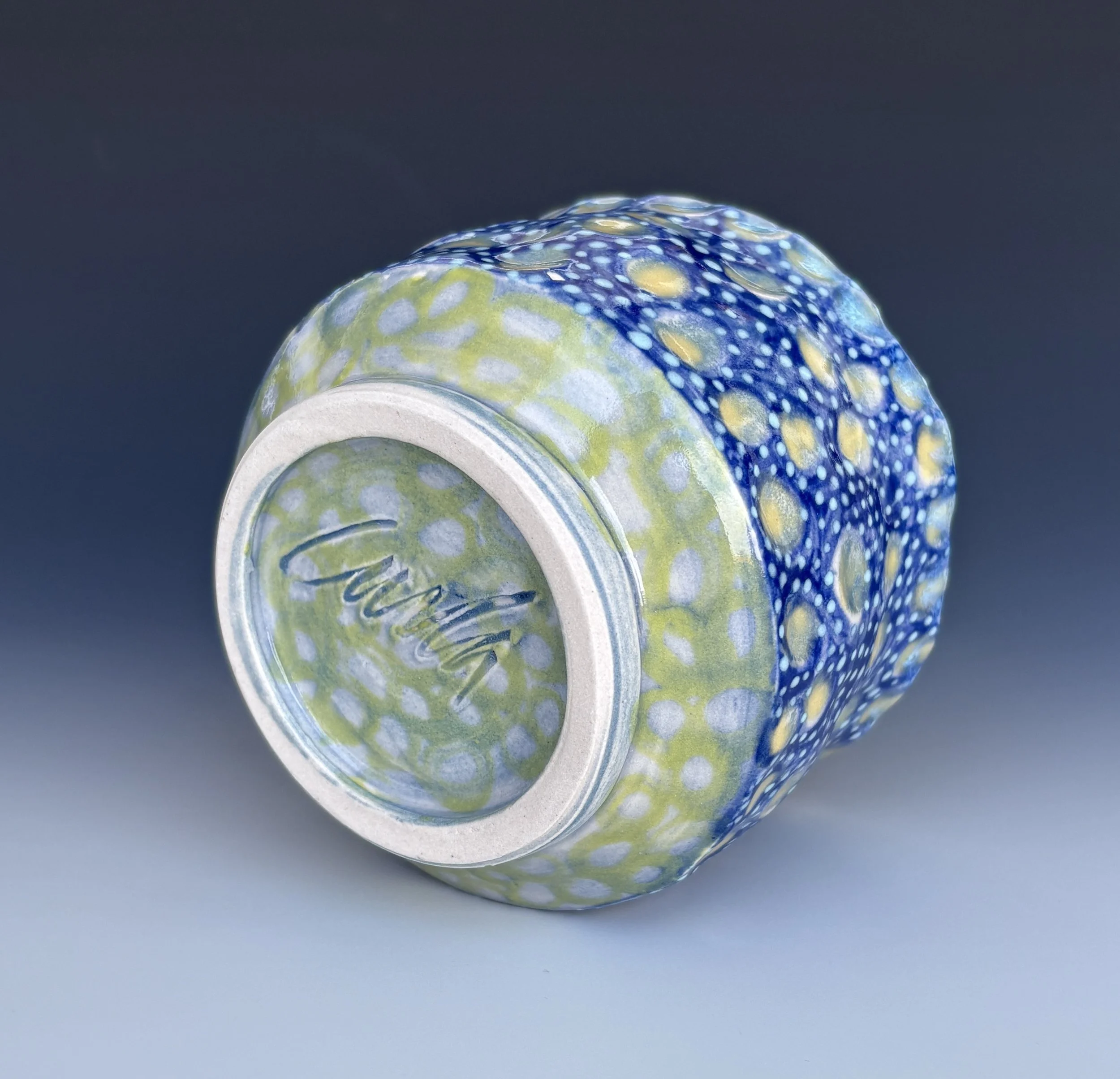 Dot Constellation 1, 3.25x4.25 round, porcelain, color slips, clear & aqua glaze. 59.00