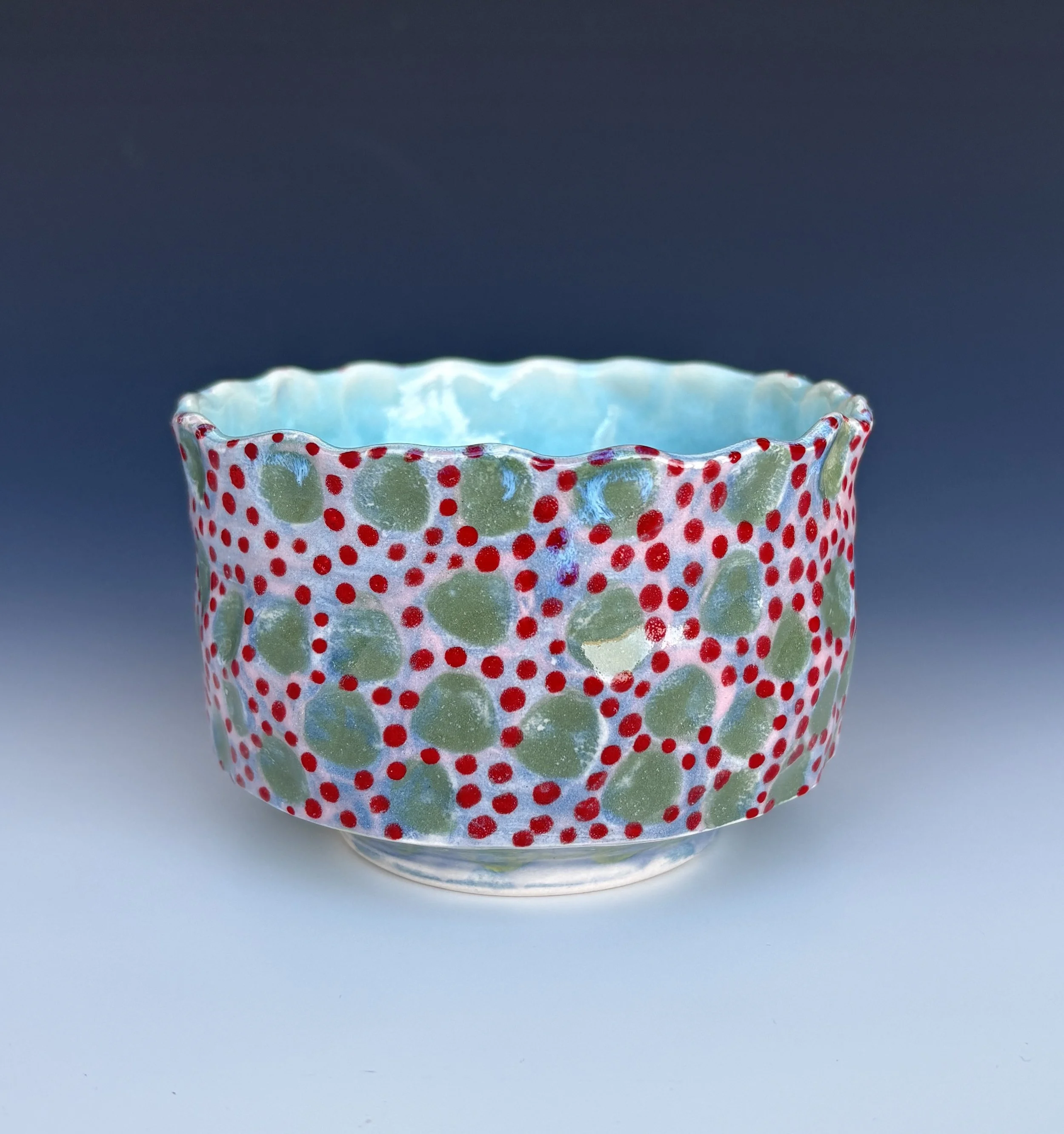 Dot Constellation 4, 2.75x4.25 round, porcelain, color slips, red underglaze, clear & aqua glaze. 59.00